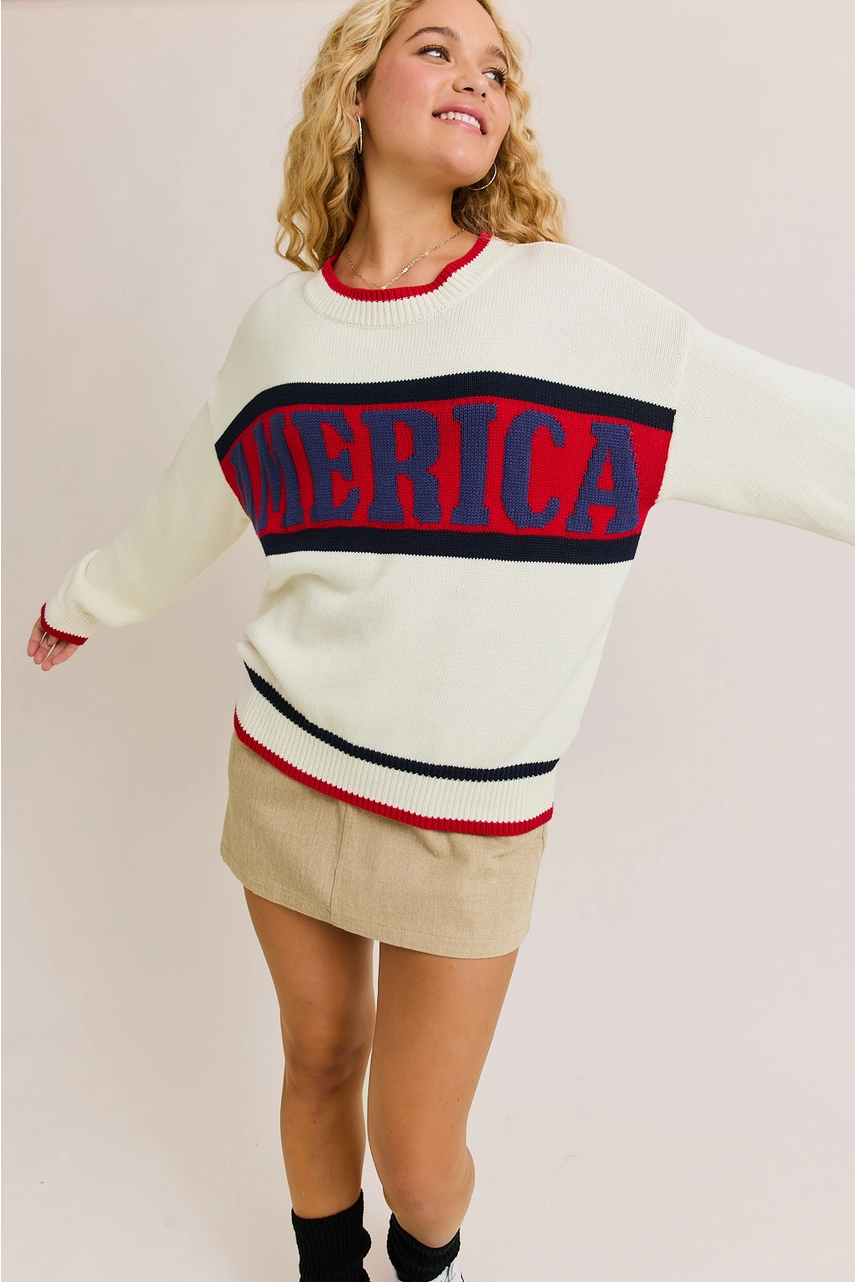 Boldly patriotic and effortlessly cozy, this “AMERICA” sweater brings vintage varsity vibes.