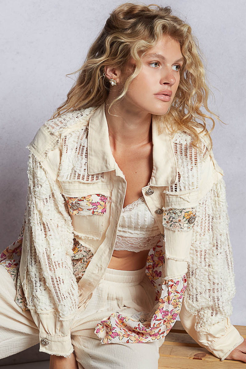 A lightweight cream jacket with floral patchwork and lace panels—boho meets romantic edge.