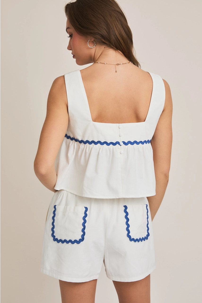 Bring coastal charm to your everyday style with this playful embroidered set. Featuring a breezy, tiered tank top with a square neckline and rickrack trim, paired with high-waisted elastic shorts adorned with delicate shell embroidery and matching trim. This set is both comfy and cute—perfect for lounging, brunching, or seaside strolls. It’s the ultimate blend of vintage-inspired sweetness and beachy flair.
