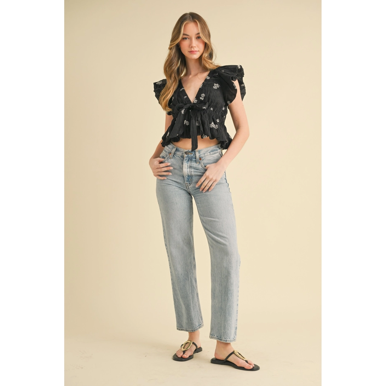 Turn heads in our Black Embroidered Tie-Front Top, a chic blend of feminine detail and effortless style. Designed with flutter sleeves, a deep v-neckline, and a flattering tie-front waist, this piece is all about making a statement while keeping it comfortable. Lightweight crinkle fabric and delicate white floral embroidery add texture and charm, making it the perfect top for date night, brunch, or a coastal getaway.