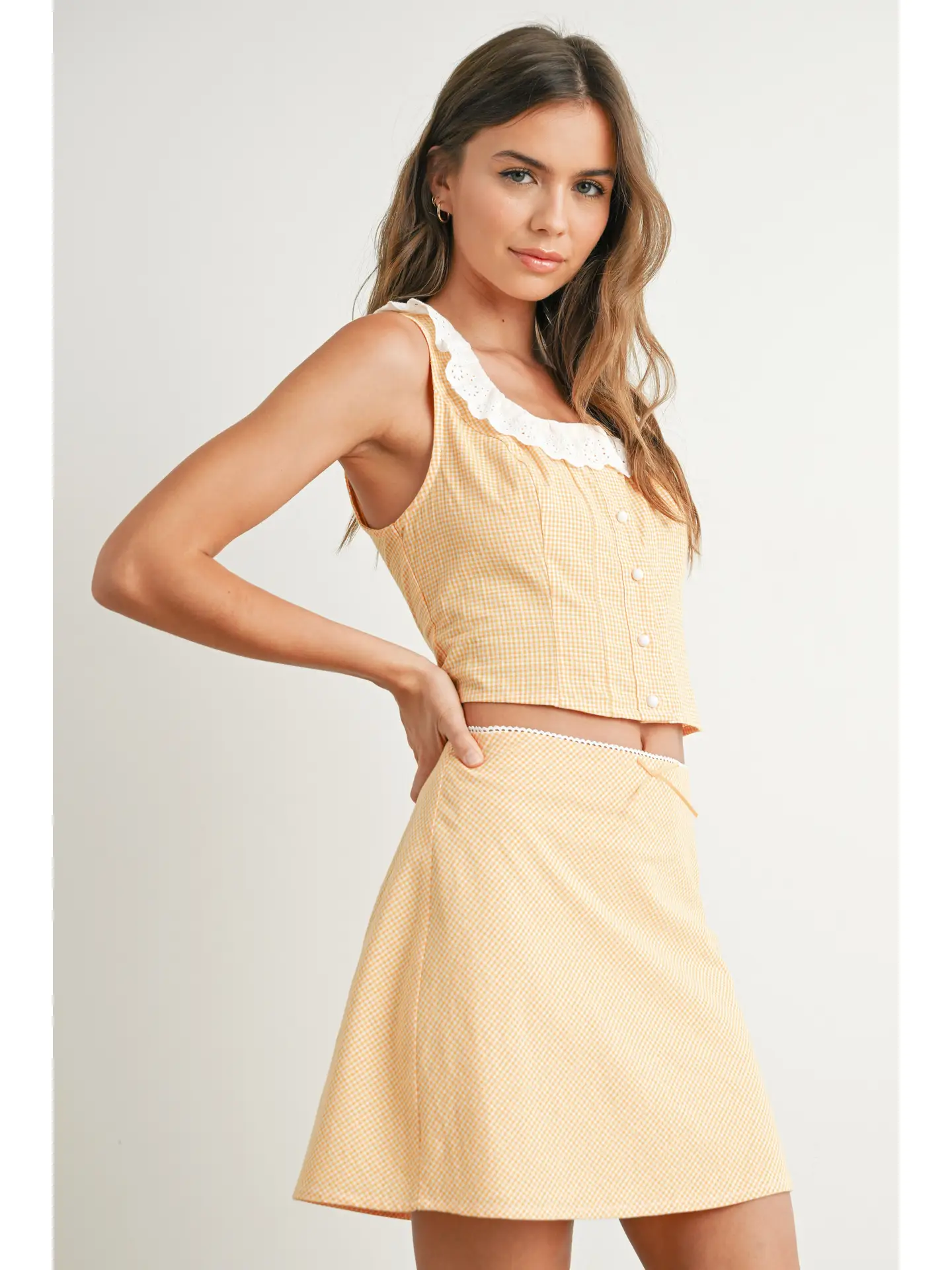 The Gingham Lace-Collar Button-Up Top blends classic style with feminine flair. Featuring a soft gingham print and a delicate lace collar, this blouse is perfect for adding a polished touch to both casual and dressy outfits.