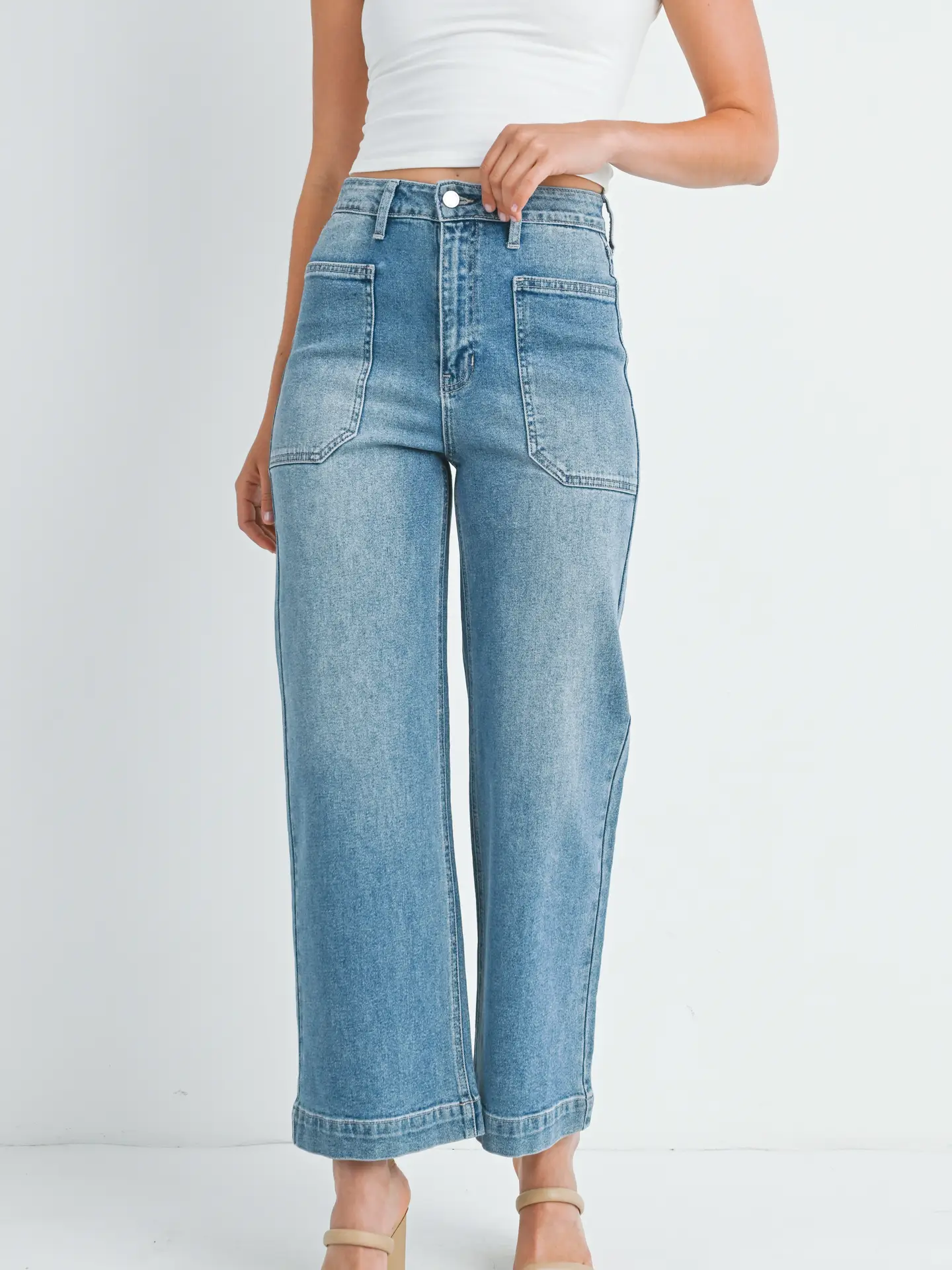 A high-rise, wide-leg jean with subtle fading and utility-inspired details for a modern, polished look.