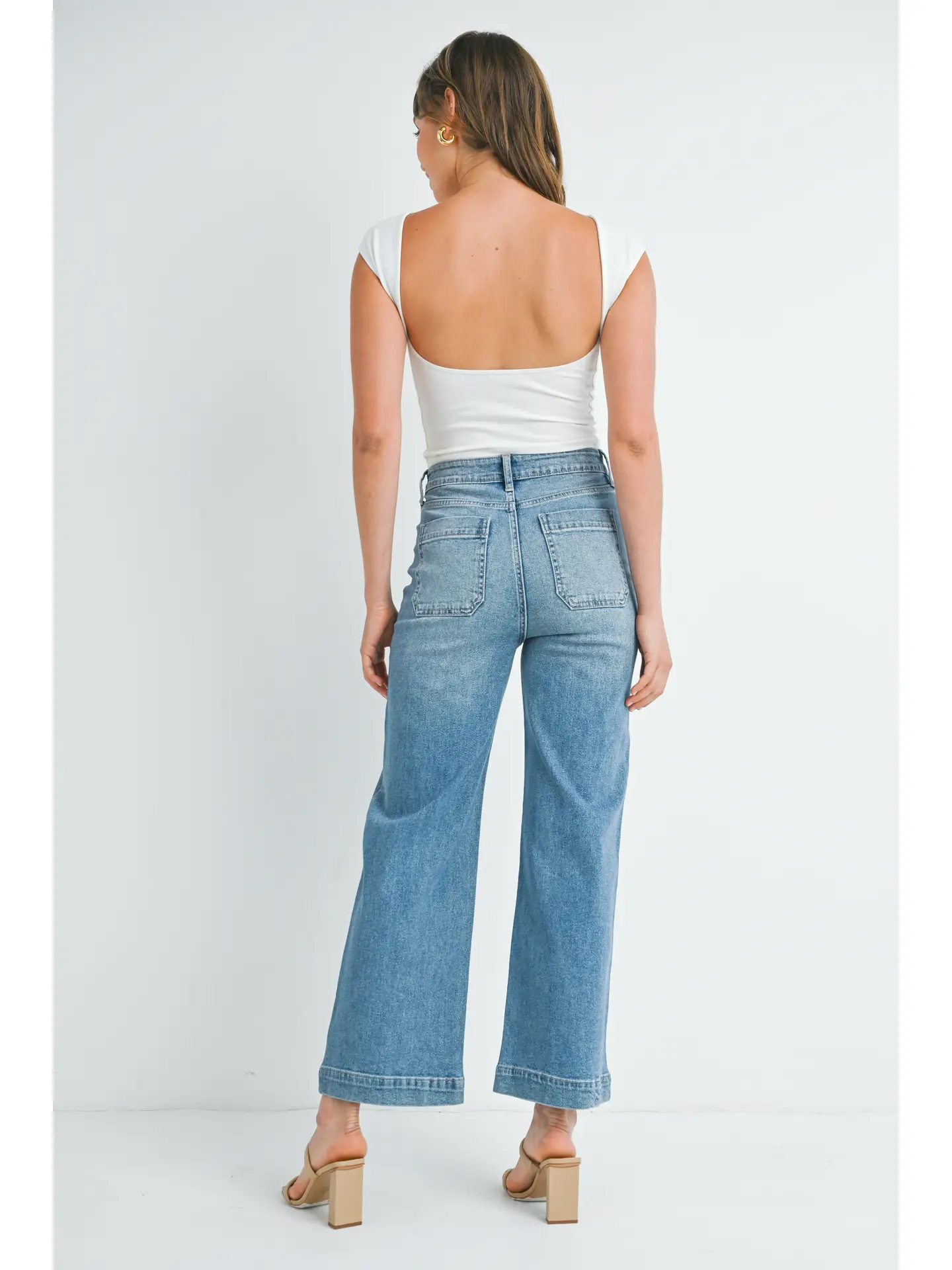 This medium rinse wide leg jean blends structure and softness with a flattering 12″ high rise, 28″ inseam, and 10″ leg opening. Subtle thigh fading adds depth, while utility-inspired details give just the right amount of edge—without going full cargo. The Eve Utility Pant is the perfect mix of modern and effortless, ready to elevate your everyday wardrobe.
