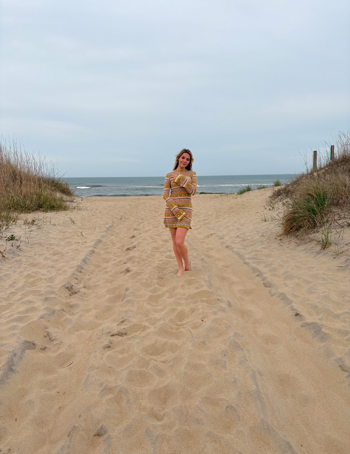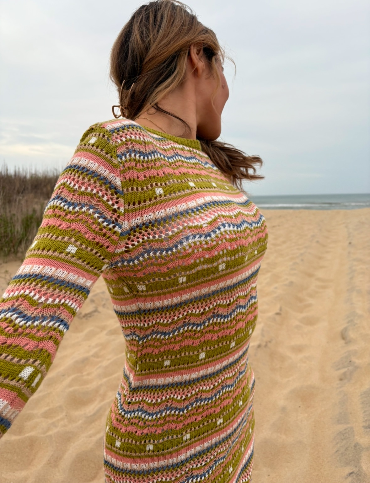 A vibrant, multicolored sweater dress perfect for cool weather and stylish layers.