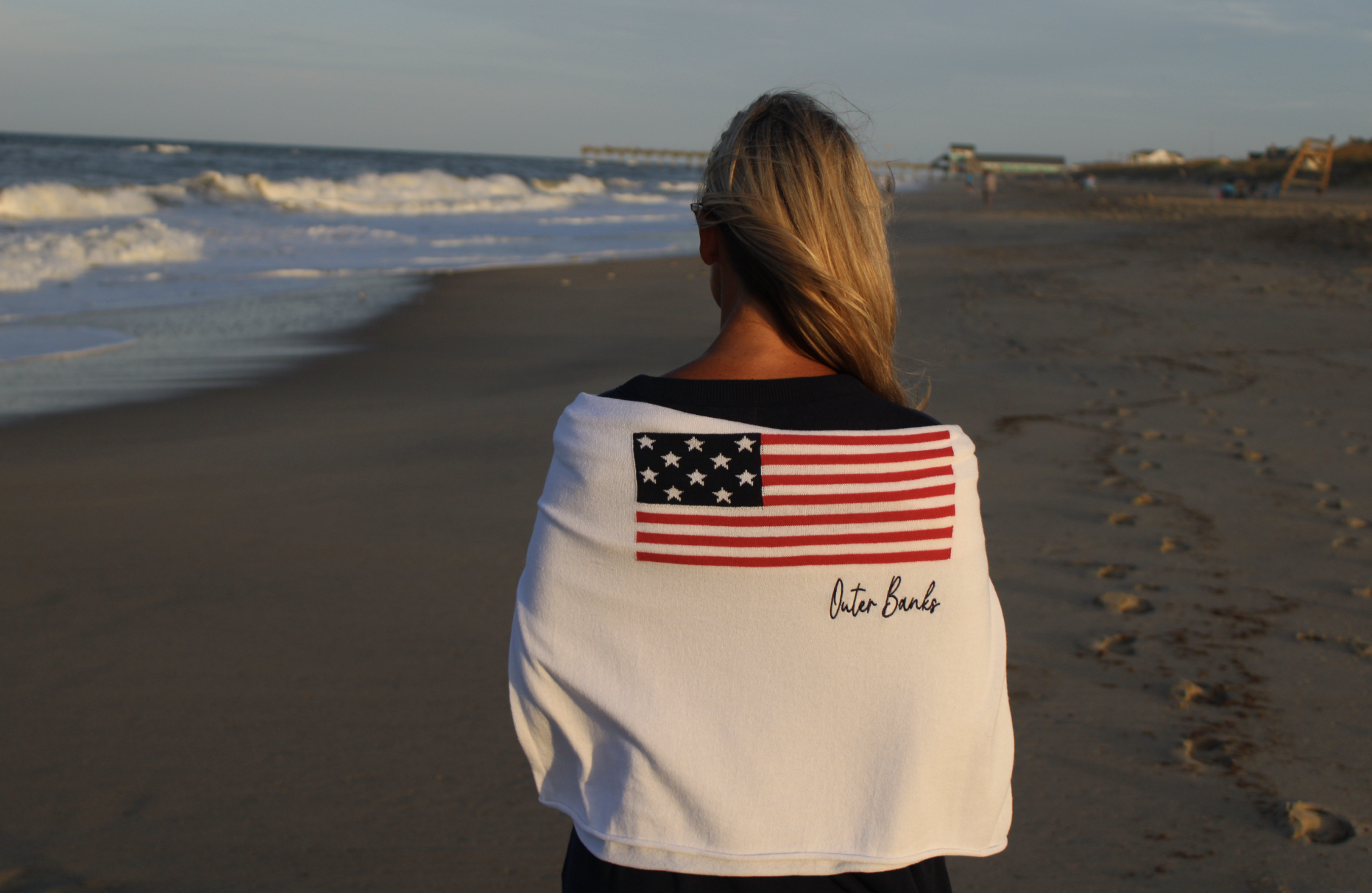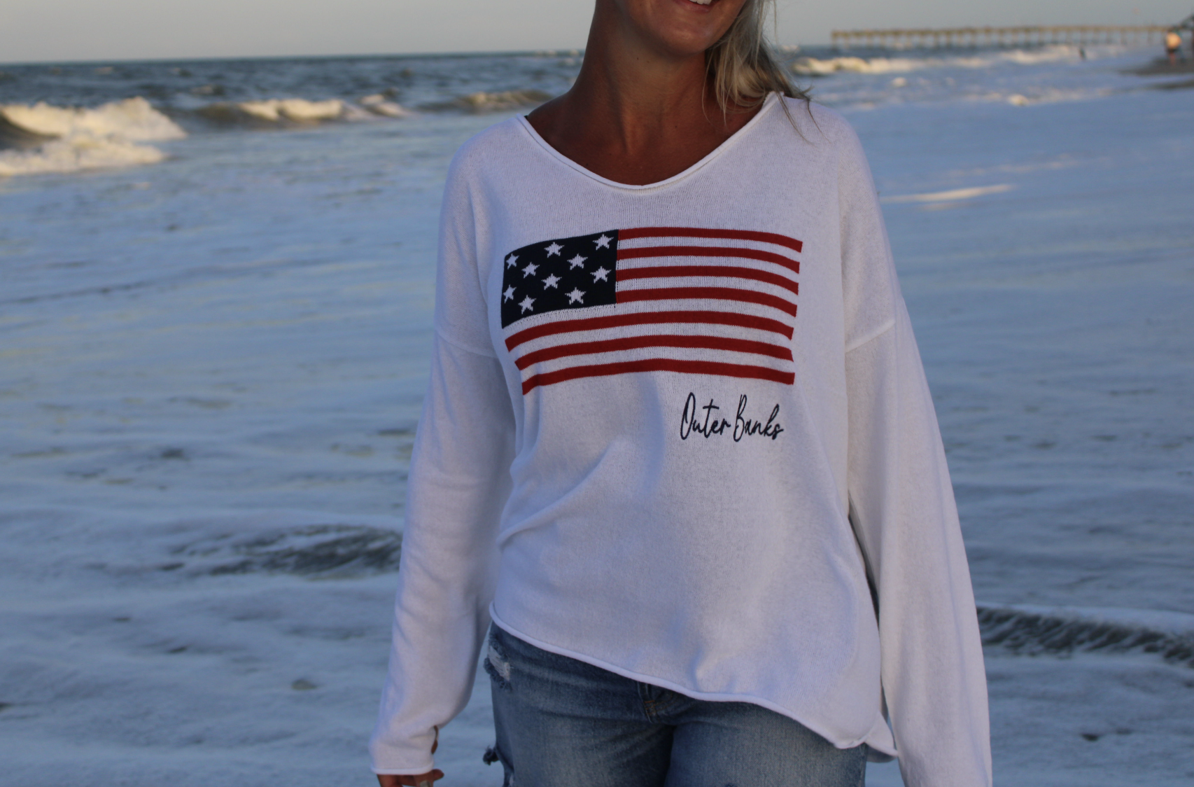Keep it timeless with our Classic OBX Script Soft Rolled V-Neck Sweater — available in two signature styles. Choose the versatile camel tone with crisp white “Outer Banks” lettering for an understated coastal look, or go bold with our Stars & Stripes design featuring a relaxed fit, knit American flag, and “Outer Banks” script. Both are year-round staples that pair effortlessly with jeans, shorts, or layered over a swimsuit.