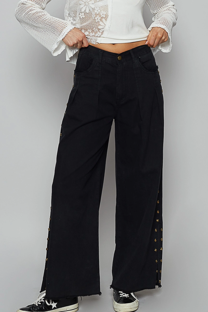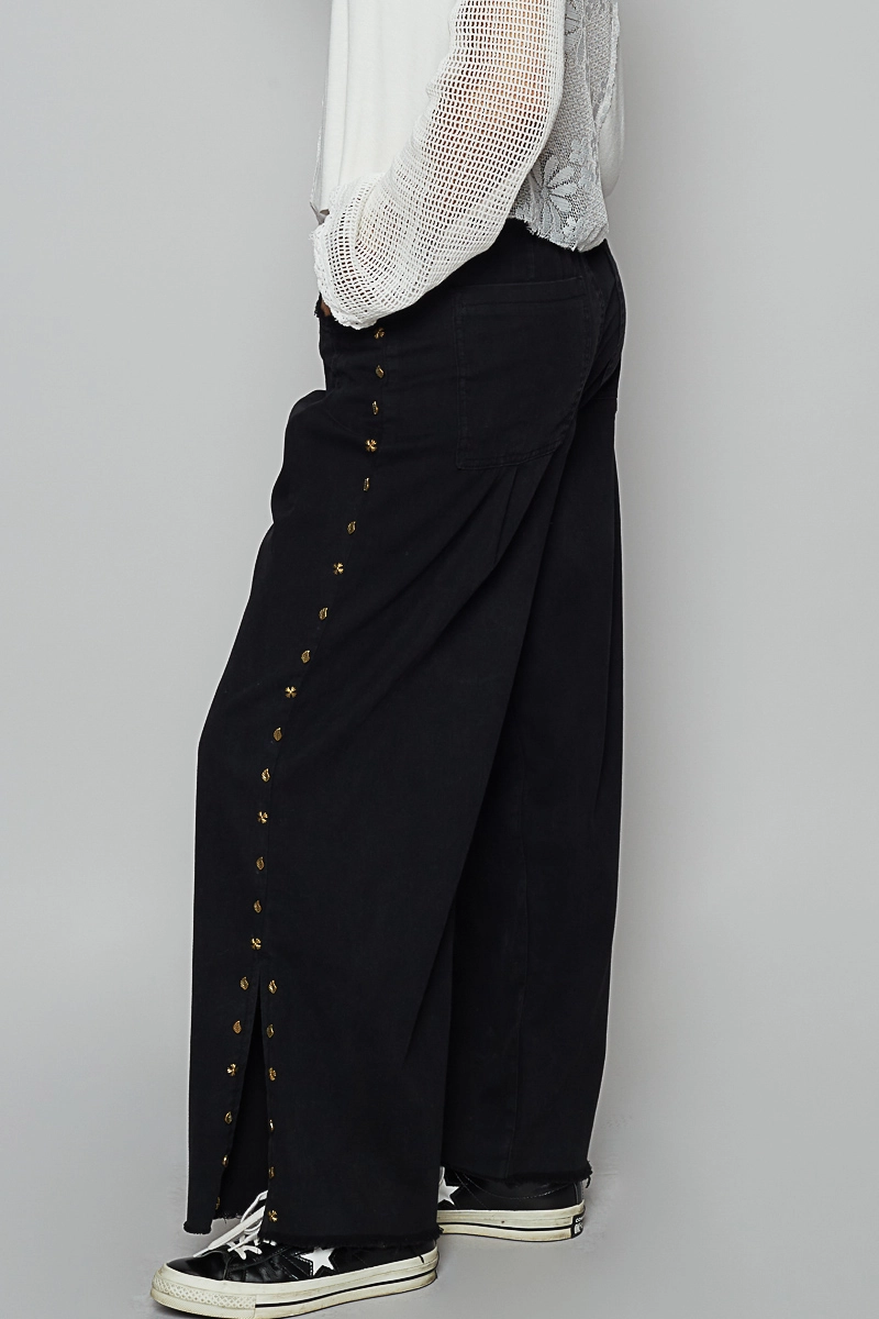 A fresh take on effortless cool, our Leaf Embellished Wide-Leg Pants bring a subtle yet standout twist to your wardrobe. With a relaxed high-rise fit and dramatic wide leg, these pants are all about laid-back style that turns heads. Delicate gold leaf embellishments trace down the sides, catching the light and adding just the right amount of edge-meets-elegance.